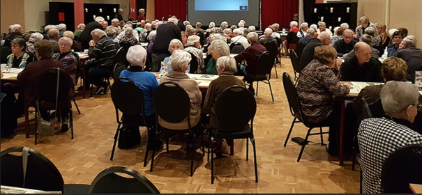 Donderdag 14 november. Historische Kring Angeren, Dorpshuis Angeren en Stichting actieve senioren Angeren kunnen terugzien op een geslaagde, gezamenlijk georganiseerde stamppot-middag. Meer dan 125 deelnemers hebben een geweldige , amusante, gezellige Angerense middag beleefd. Nadat dominee Theo de Zwart zich had voorgesteld, vroeg Geert Bouwman aan de volle zaal: “wat schaft de (stamp)pot?” Aan de hand van fotoos uit het Angerse verleden werd het antwoord wel duidelijk. De pot schafte: wat op het eigen land stond of wat in weckflessen, keulse potten eiges was ‘iengemak’ en in de kelder stond.